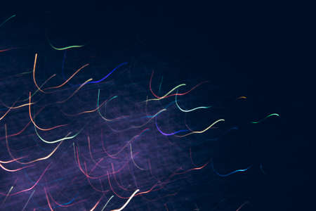 Abstract background of colorful lines in motion on black. Bokeh of defocused splashes, blurred red and blue neon leds, fireworks and salute, space and sky backdrop