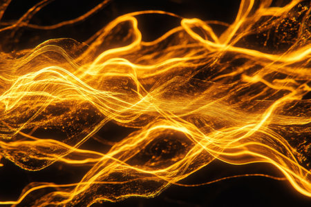 Abstract fiery energy waves, dynamic orange and yellow light trails flowing seamlessly, bold and energetic