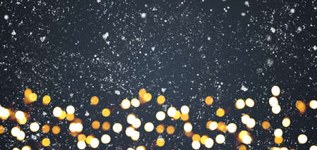 Christmas background with golden bokeh lights and snowflakes on dark background