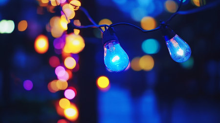Two blue string lights are illuminated, casting a vibrant glow. Bokeh lights in yellow, pink, and green are visible in the background.