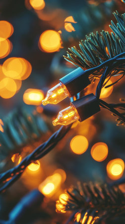 Close-up Christmas tree decorated with twinkling lights, festive decor.
