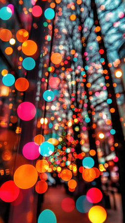 Multicolored bulbs provide soft light creating a cozy and inviting atmosphere. The blurred circles add a dreamlike quality to the warm evening setting.