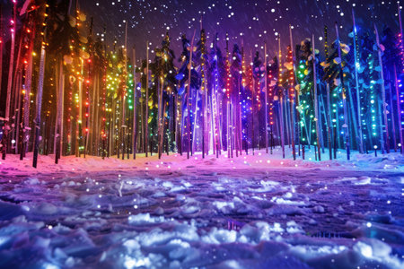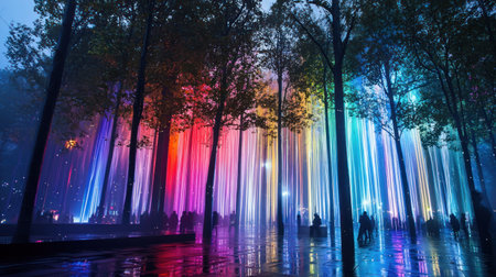 A stunning nighttime scene featuring a forest illuminated by a spectrum of colorful lights, reflecting on a wet surface.