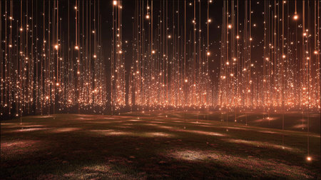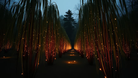 A close-up shot of illuminated plants with bokeh lights in a dark setting, creating a magical atmosphere.