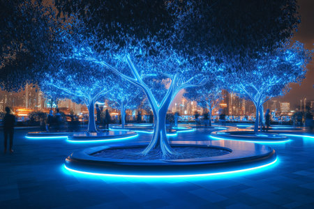 Futuristic urban park with bioluminescent trees and interactive light sculptures for innovation