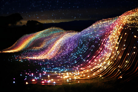 A dynamic shot of light trails in electric yellow, green, and blue forming wave-like patterns across a midnight sky.