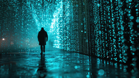 A solitary figure walks through a vibrant tunnel filled with glowing blue particles, symbolizing a journey into the unknown and evoking a sense of wonder and exploration.