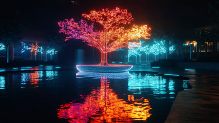 Night scene of a glowing tree with pink and orange lights reflected in a dark blue water. Surrounding trees are also illuminated, creating a magical atmosphere. Digital art style.