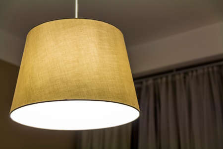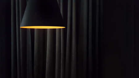 Close-up on a modern lamp against the background of the folds of curtains in dark colors with copy space.