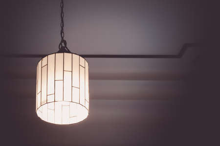 vintage lantern which has bulb inside and hanging on the ceiling of relaxing area, soft and selective focus.