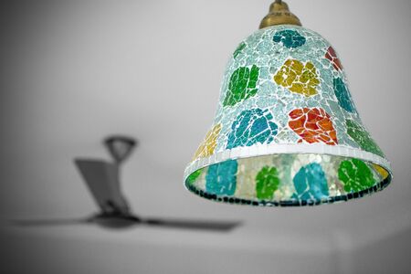 A multicolored lamp-shade dangling from ceiling of room with a fan in the backdrop