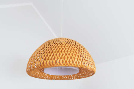 Hanging lamps made from bamboo weave with decorative lights on the old walls during the night time