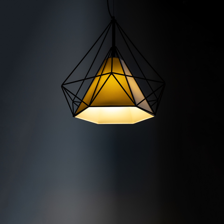 Modern lamp hanging down from ceiling in the dark background. Minimalist chandelier with glowing warm light from bulb. - Image