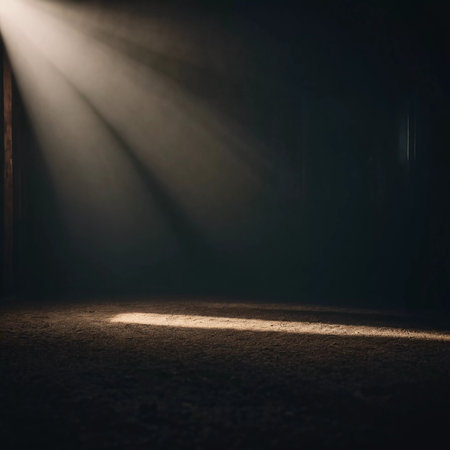 An empty, dark room with a single light source creates an atmosphere of mystery. The reflective floor enhances the dramatic contrast between light and darkness.