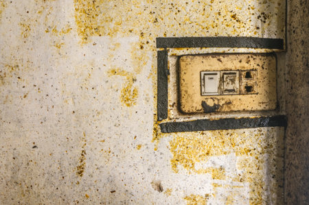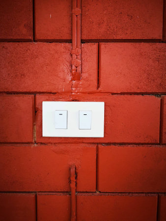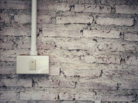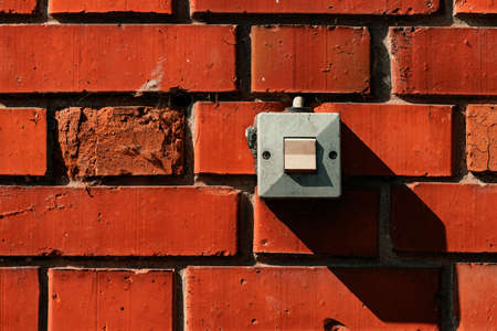 Old waterproof electricity switch mounted on house outer brick wall, copy space included