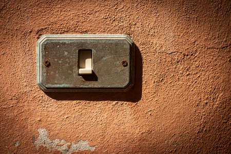 Closeup of an old and rusty Light Switch on a red wall. Tellaro village, Liguria, Italy, Europe