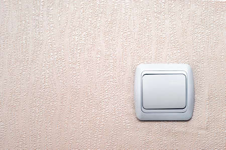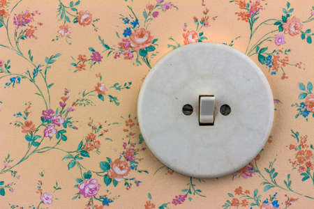 Old White Light Switch on Pinky Textured Wallpaper Background with Copy Space.