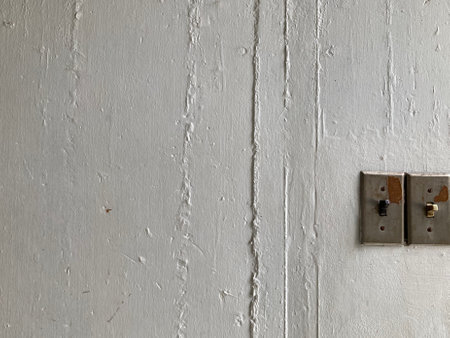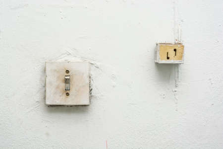 two antique light switches mounted on a rough white-painted cement wall, using for background