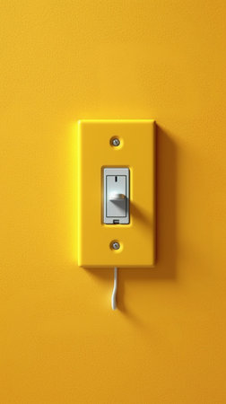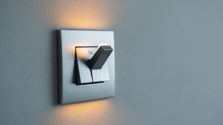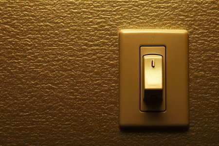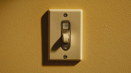 A minimalist light switch captured in a close-up view, set against a textured wall, bathed in soft ambient light, perfect for showcasing modern interior design elements.