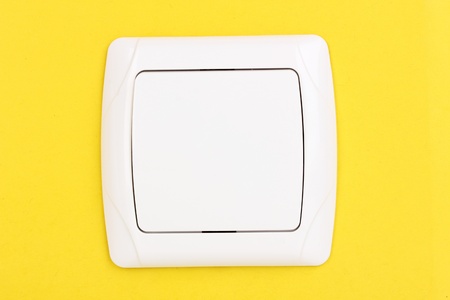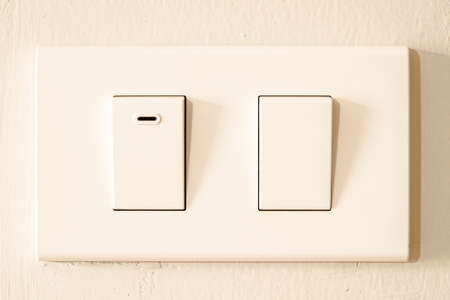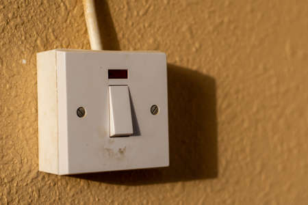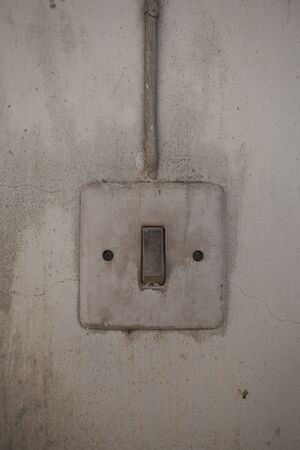 One white light switch installed on the white concrete wall for turn on/off lamp and electrical cable with copy space
