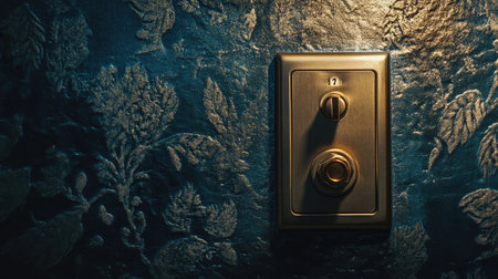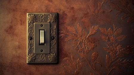 A close-up image of a vintage light switch set against richly textured wallpaper, creating a warm atmosphere ideal for interior decor projects.