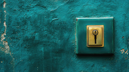 Capture the essence of rustic charm with this vintage keyhole switch plate against a weathered teal wall, ideal for enhancing interior design aesthetics and home decor projects.