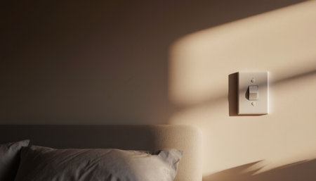 Warm rays of evening sun illuminate a peaceful bedroom corner, highlighting a light switch beside a plush pillow. The tranquil atmosphere invites relaxation and comfort.