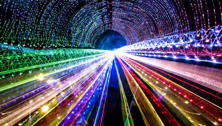 This captivating image showcases a tunnel illuminated by colorful neon lights, creating a dynamic and energetic atmosphere at night. The light trails symbolize motion and speed, reflecting creativity in urban design.