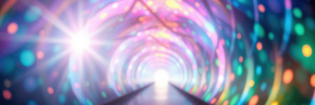 Colorful light tunnel with vibrant patterns and glowing orbs leading to bright exit point