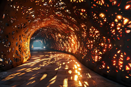 A glowing pathway illuminated by a tunnel with intricate cutouts