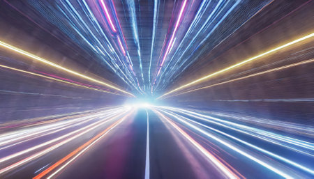 A striking image of a futuristic tunnel illuminated by dynamic light trails, creating an impression of speed and motion. Ideal for themes of technology and journey.