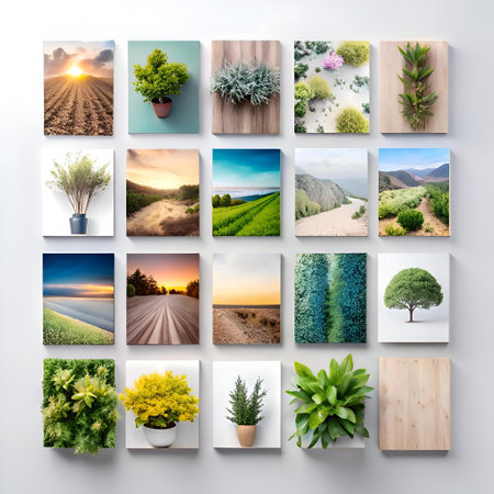 An artful display of diverse seasonal and natural scenes, arranged on a sleek gray backdrop that highlights the vivid colors and tranquil moods through subtle reflection