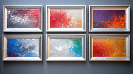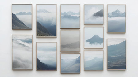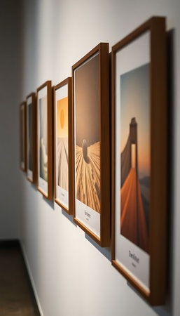 Framed visuals of diverse subjects are arranged on a sleek wall, creating a captivating gallery that combines modern design with artistic expression.