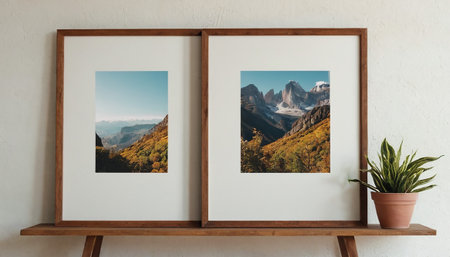 Minimalist wooden and white picture frames on shelf against light wall