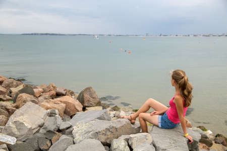 Young woman in summer clothes sitting on big boulders on sea shore looking on horizon.