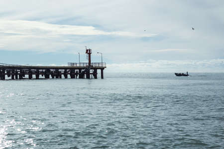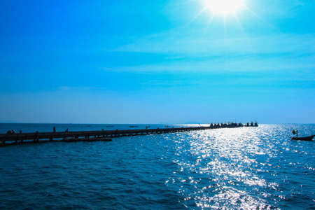 View from sand beach to water of sea, waves and pier in a nice day or evening with blues sky, bright sun and white clouds. The concept of a holiday on the sea or ocean in the South