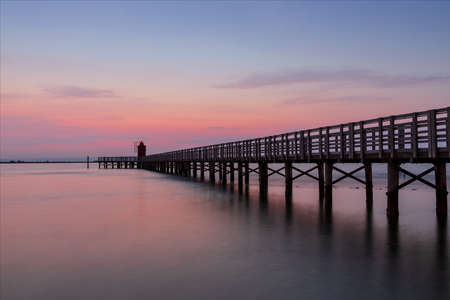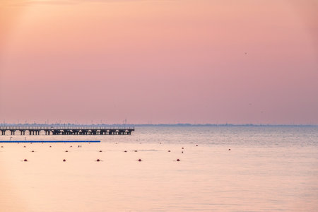 Landscape of Gdanska bay with pier in Jastarnia photographed before sunrise.Landscape with pastel colors of sunrise. Moon setting over sea.
