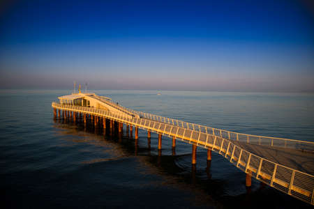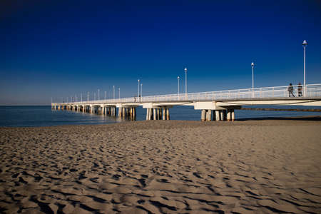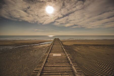 Wooden pier in the morning sun, beach of Lido Di Jesolo, Italy