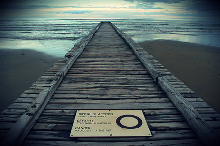 Digitally manipulated image of a wooden pier on the seashore.