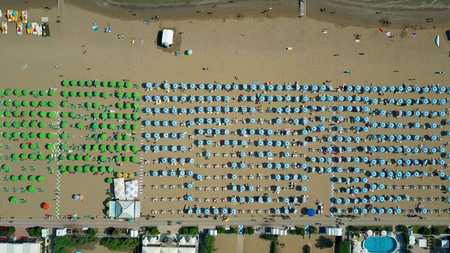 Aerial top down view of a big crowded sandy beach in Italy. Summer vacation time