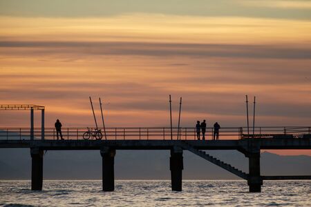 Adler, Sochi, Russia, 11.01.2021. People on the sea pier. Vacationers and fishermen on the Black Sea coast in autumn