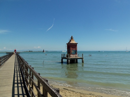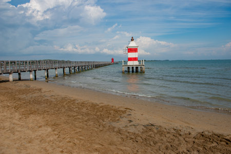Wooden pier and lighthouse in Lignano Sabbiadoro Italy
