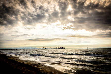 Beach landscape with pier and waves of the sea in the sand (Jesolo, Italy)