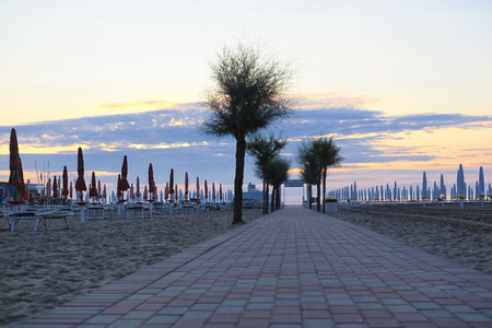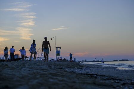Beach landscape at dawn. Piers perspective view with people. Jesolo beach view, Italian panorama