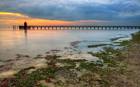 Long exposure of the pier and Chesapeake Bay at sunrise, in North Beach, Maryland.