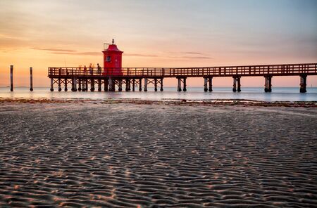 Sunrise at the red lighthouse of Lignano, landscape on the sea with a pedestrian promenade.