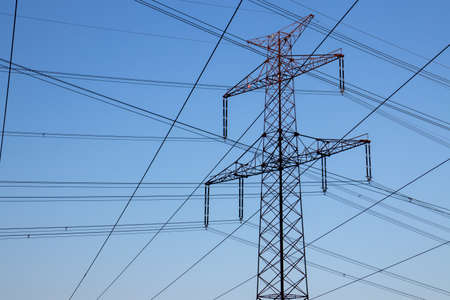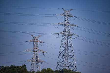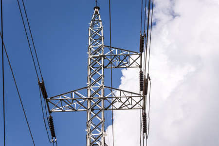High voltage power line on industrial electricity line tower. Energy transmisson with overhead power line