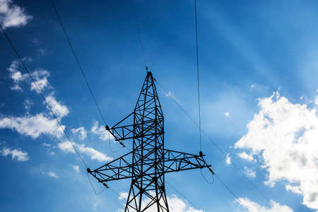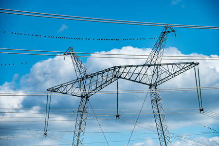 Large power lines metal carrier pylons in Europe. Low angle shot, cloudy blue sky background, no people.