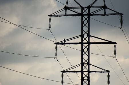 Electricity distribution tower with copy space. High voltage power lines under cloudy sky. Minimalist view from below on poles with wires at overcast weather. Atmospheric electrical background.