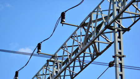 High-voltage power line with the poles, insulators and wires on a background of sky